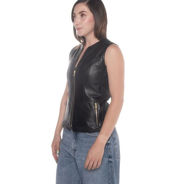 El chaleco Jessy, confeccionado en piel de borrego pelibuey, es una prenda versátil diseñada para adaptarse a cualquier ocasión, desde un look casual hasta una salida con un toque vaquero elegante. Sus resortes laterales modelan la silueta, resaltando cintura y cadera de forma natural y ofreciendo un ajuste perfecto.